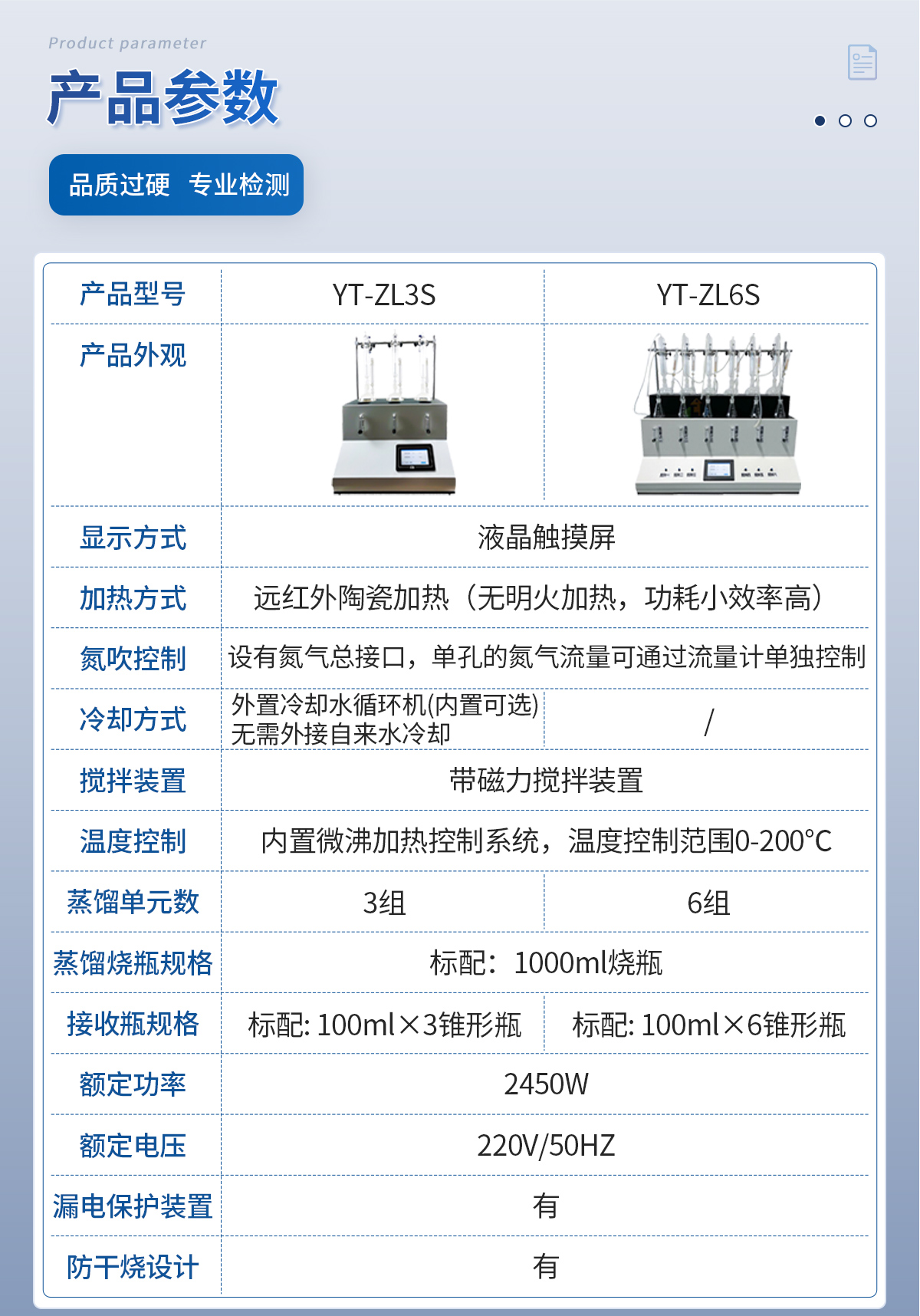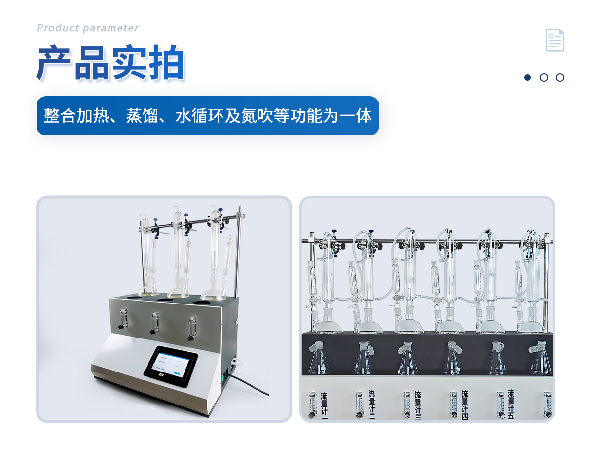 主要原理是根據(jù)藥典中所提供的檢測方法,將中藥材以蒸餾法進行處理,樣品中的亞硫酸鹽系列物質(zhì)加酸處理后轉(zhuǎn)化為二氧化硫后,隨氮氣流帶入到含有雙氧水的吸收瓶中,雙氧水將其氧化為硫酸根離子,采用酸堿滴定法測定,計算藥材及飲片中的二氧化硫殘留量。本產(chǎn)品在嚴格遵循藥典要求的基礎(chǔ)上,整合加熱,蒸餾,水循環(huán)及氮吹等功能為一體,可同時提供3-6個樣品(空白樣,平行樣)的處理,從而極大的提高了檢測數(shù)據(jù)的精度和減少了工作時間。