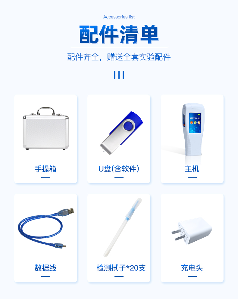 隨機配置:菌落總數(shù)檢測儀(手持)主機、鋁合金手提箱、驅(qū)動U盤、儀器包、掛繩、PC數(shù)據(jù)線、數(shù)據(jù)分析軟件、中文操作手冊。