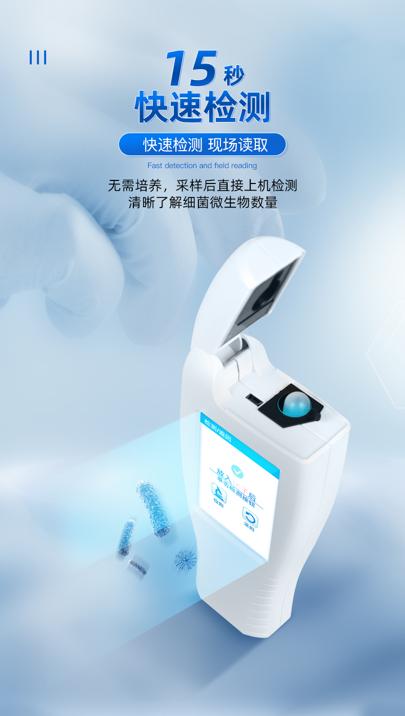 該設(shè)備為全新升級產(chǎn)品,大屏幕觸摸顯示屏,代替?zhèn)鹘y(tǒng)按鍵。操作采用生物化學反應(yīng)方法檢測ATP含量,ATP熒光檢測儀基于螢火蟲發(fā)光原理,利用“熒光素酶—熒光素體系”快速檢測三磷酸腺苷(ATP)。ATP拭子含有可以裂解細胞膜的試劑,能將細胞內(nèi)ATP釋放出來,與試劑中含有的特異性酶發(fā)生反應(yīng),產(chǎn)生光,再用熒光照度計檢測發(fā)光值,微生物的數(shù)量與發(fā)光值成正比,由于所有生物活細胞中含有恒量的ATP,所以ATP含量可以清晰地表明樣品中微生物與其他生物殘余的多少,用于判斷衛(wèi)生狀況。