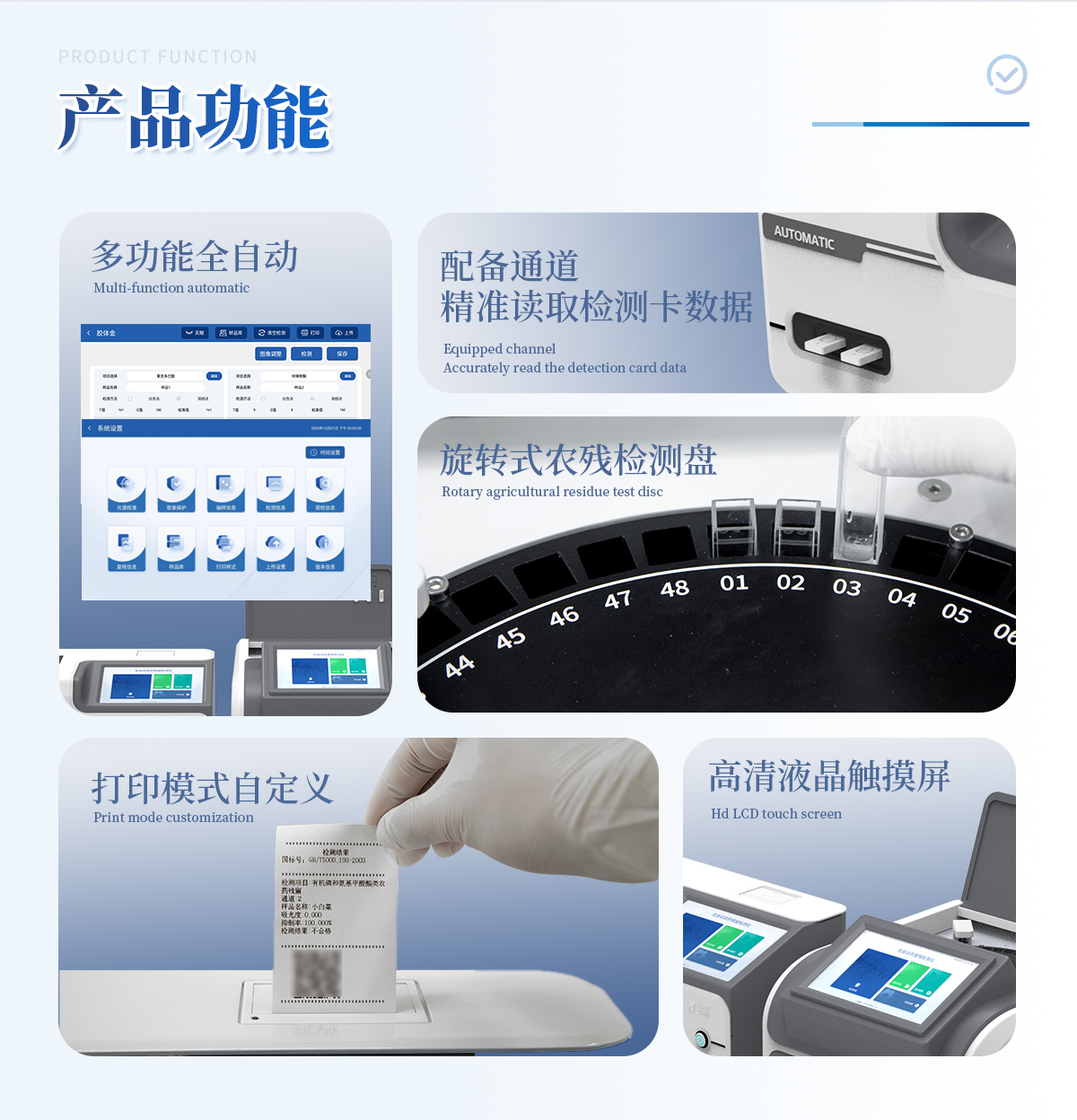 | 1. 試劑位置:3個(gè) | 2. 農(nóng)殘檢測(cè)盤(pán):旋轉(zhuǎn)24通道比色盤(pán),可任意選擇檢測(cè)通道,自動(dòng)對(duì)應(yīng)選擇通道。 | 3. 膠體金通道:2個(gè),可讀取檢測(cè)卡結(jié)果,自動(dòng)采集、處理分析,自動(dòng)判斷檢測(cè)結(jié)果,并具備自動(dòng)判空功能。 | 4.系統(tǒng)配置:10.1寸高清液晶觸摸屏,采用ARM Cortex?-A7,RK3288/4核處理器,運(yùn)行內(nèi)存1GB。Android7.1.1 系統(tǒng)分辨率1280×800。 | 5.恒溫系統(tǒng):具有自動(dòng)加溫溫控系統(tǒng),精準(zhǔn)恒溫37℃,精度±0.1℃。 | 6.添加系統(tǒng):儀器按照試劑要求自動(dòng)、按時(shí)、按量加入試劑,并且自動(dòng)對(duì)未正常放置的樣本或異常的樣本進(jìn)行檢查并提示。 | 7.清洗功能:儀器具備回流及自動(dòng)清洗管路功能,避免試劑污染。 | 8.混勻功能:設(shè)備具備自動(dòng)混勻功能。 | 9.光源校準(zhǔn):設(shè)備可自動(dòng)校準(zhǔn),確保檢測(cè)準(zhǔn)確度。 | 10.實(shí)時(shí)監(jiān)控:儀器測(cè)試過(guò)程中屏幕顯示運(yùn)行狀態(tài),可實(shí)時(shí)查看。 | 11.數(shù)據(jù)存儲(chǔ):內(nèi)部存儲(chǔ)16GB,可存儲(chǔ)500萬(wàn)條數(shù)據(jù)。 | 12.樣品多選功能:設(shè)備具備樣品一鍵多選功能,選擇樣品自動(dòng)匹配檢測(cè)通道。 | 13.項(xiàng)目預(yù)設(shè):可提前設(shè)置單個(gè)及多個(gè)相同或不相同的檢測(cè)任務(wù),可單次或者多次調(diào)取,減少檢測(cè)時(shí)間。 | 14.自定義打印系統(tǒng):內(nèi)置自定義打印系統(tǒng),可按需靈活設(shè)置開(kāi)啟或關(guān)閉:產(chǎn)品合格證(國(guó)家農(nóng)業(yè)部標(biāo)準(zhǔn)),二維碼,抽樣信息、檢測(cè)信息,受檢信息等信息的打印。 | 15.A4版本報(bào)告打印功能:設(shè)備可自動(dòng)生成A4版報(bào)告,A4報(bào)告帶二維碼,可掃描二維碼生成電子版,并可識(shí)別真?zhèn)巍?/td> | 16.傳輸方式:儀器配備無(wú)線通信模塊: 4G(APN)通訊模塊、Wifi模塊,藍(lán)牙傳輸模塊,同時(shí)具有USB接口以及RJ45接口能以多種方式實(shí)現(xiàn)數(shù)據(jù)保存和數(shù)據(jù)傳輸功能,設(shè)備數(shù)據(jù)可以同步上傳至平臺(tái)。 | 17.系統(tǒng)17.數(shù)據(jù)監(jiān)管系統(tǒng):設(shè)備自帶監(jiān)管平臺(tái),并可同步對(duì)接監(jiān)管平臺(tái),數(shù)據(jù)可局域網(wǎng)和互聯(lián)網(wǎng)數(shù)據(jù)上傳,檢測(cè)結(jié)果可直接傳至食品安全監(jiān)管平臺(tái)。達(dá)到食品安全問(wèn)題預(yù)估、預(yù)警。 | 18.系統(tǒng)遠(yuǎn)程更新功能:無(wú)需設(shè)備返廠,即可遠(yuǎn)程實(shí)時(shí)升級(jí)全新系統(tǒng),節(jié)省時(shí)間成本及避免運(yùn)輸造成設(shè)備損。 |