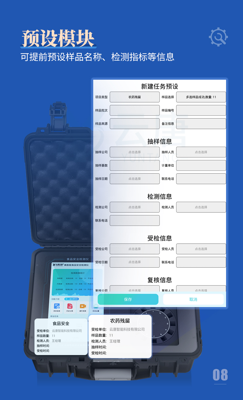 *6、儀器具有任務(wù)預(yù)設(shè)模塊,可在樣品送檢前提前預(yù)設(shè)樣品名稱、檢測指標(biāo)、送檢單位等信息,樣品送檢時一鍵調(diào)取保存信息,檢測更加方便快捷。