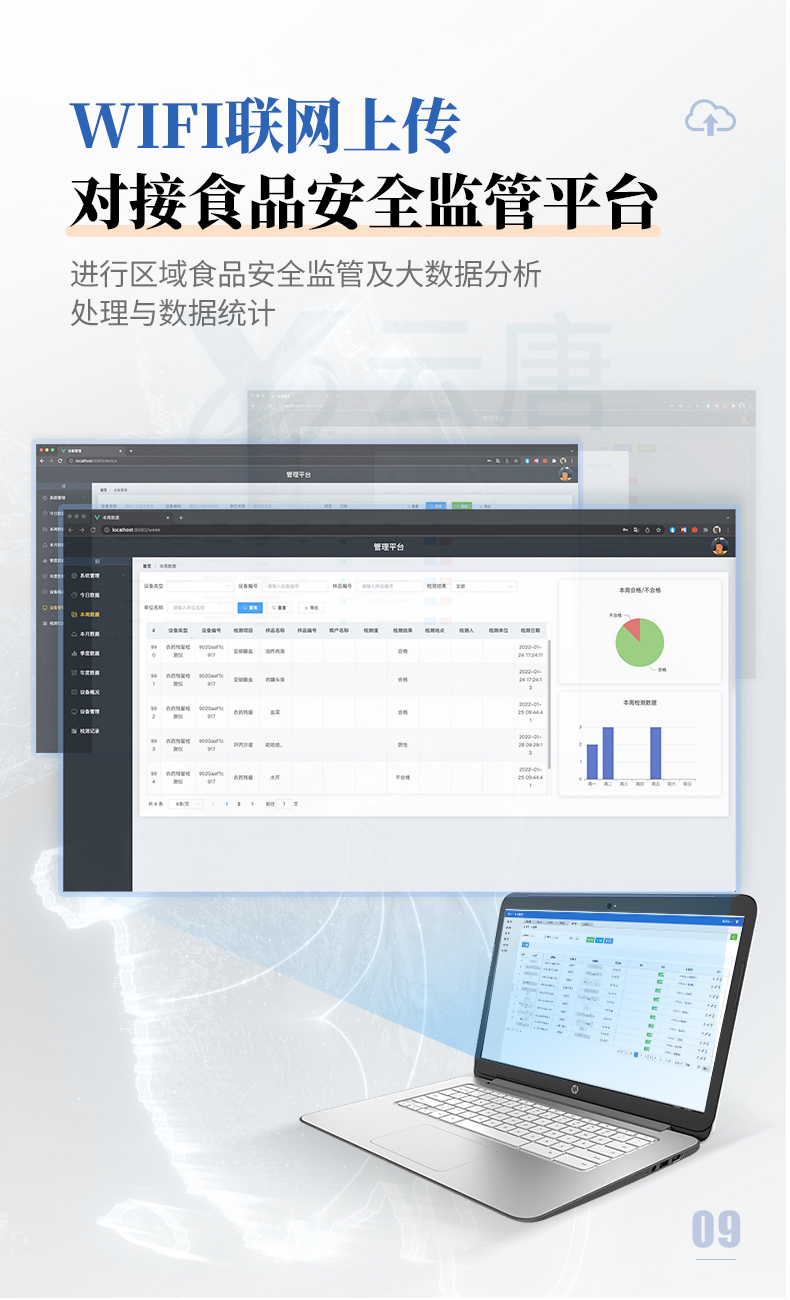 12、儀器具有 wifi 聯(lián)網(wǎng)上傳、RJ45網(wǎng)線連接功能,可以快速上傳數(shù)據(jù)。同步對接監(jiān)管平臺,數(shù)據(jù)可局域網(wǎng)和互聯(lián)網(wǎng)數(shù)據(jù)上傳,檢測結(jié)果直接傳至食品安全監(jiān)管平臺。進(jìn)行區(qū)域食品安全監(jiān)管及大數(shù)據(jù)分析處理與數(shù)據(jù)統(tǒng)計,檢測區(qū)域食品安全長短期動態(tài),達(dá)到食品安全問題預(yù)估、預(yù)警。