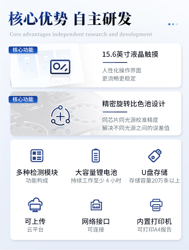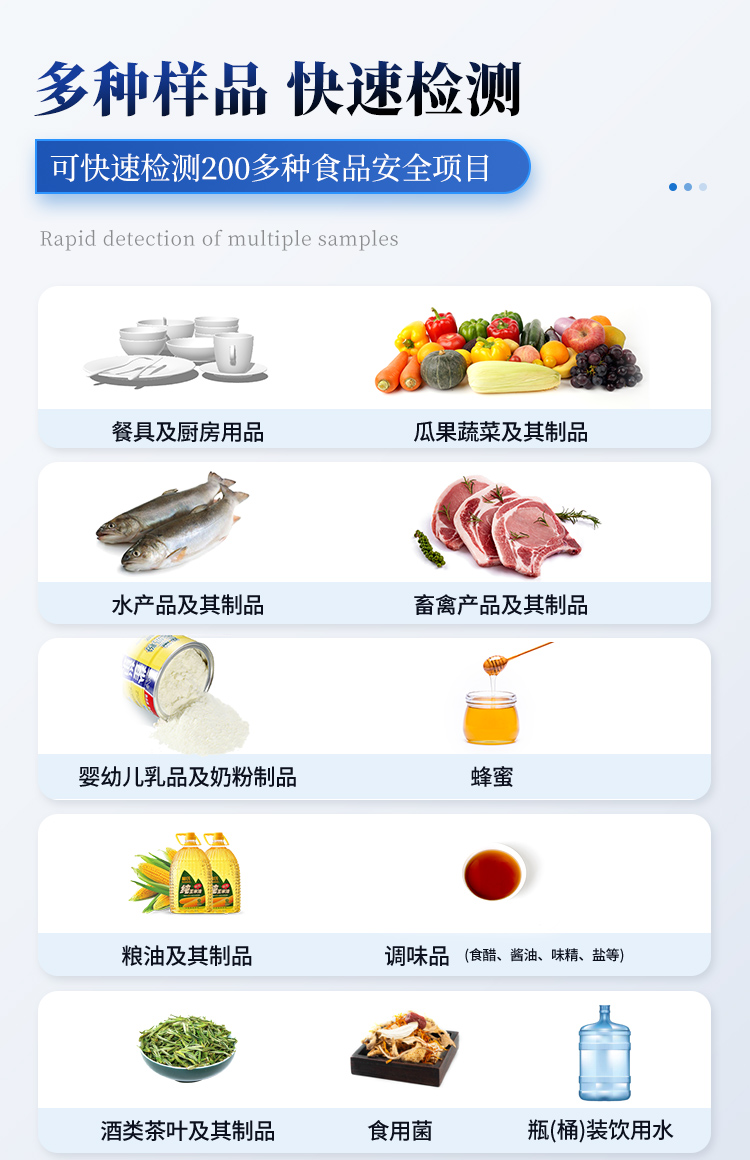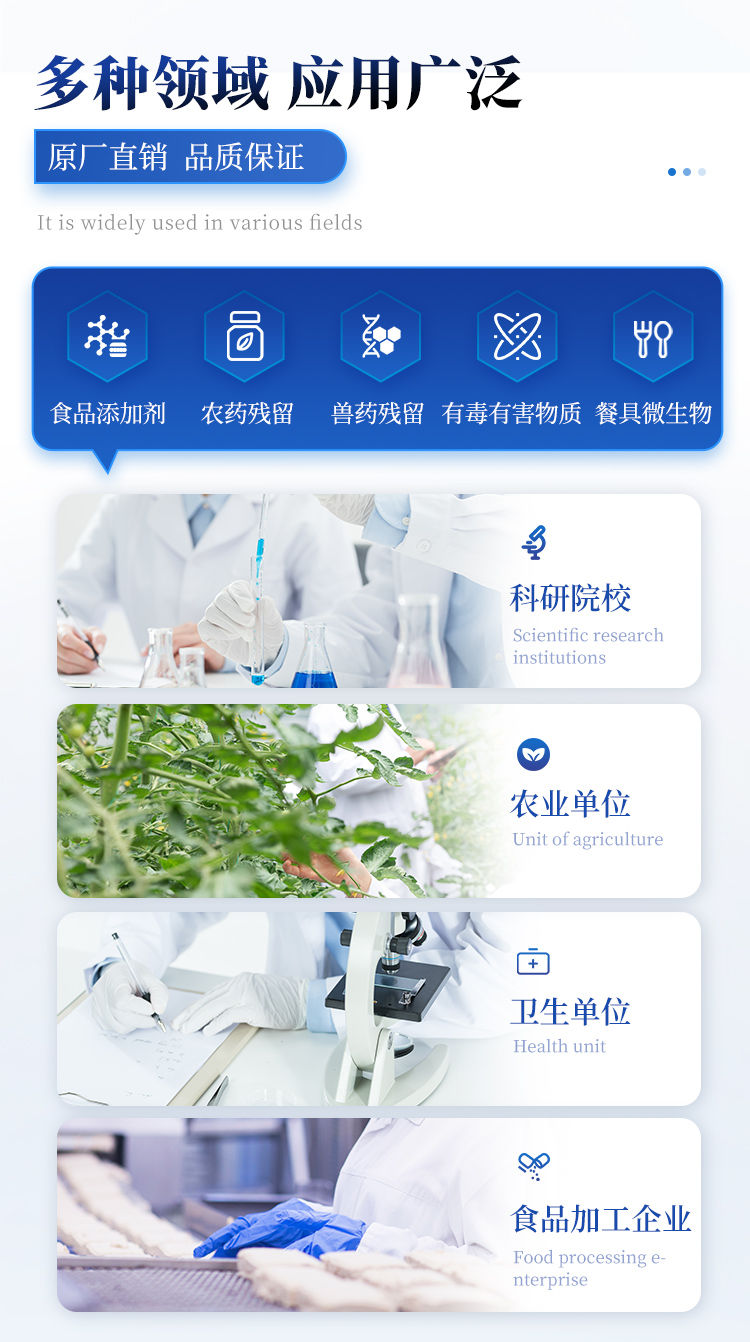 1. 功能構(gòu)成:主要包括分光光度模塊、新型農(nóng)殘檢測(cè)模塊、膠體金檢測(cè)模塊、熒光檢測(cè)模塊、數(shù)字化管理模塊等,所有模塊集成一體,可快速檢測(cè)200多種食品安全項(xiàng)目,如獸藥殘留、農(nóng)藥殘留、非法添加劑、細(xì)菌數(shù)值等指標(biāo)。