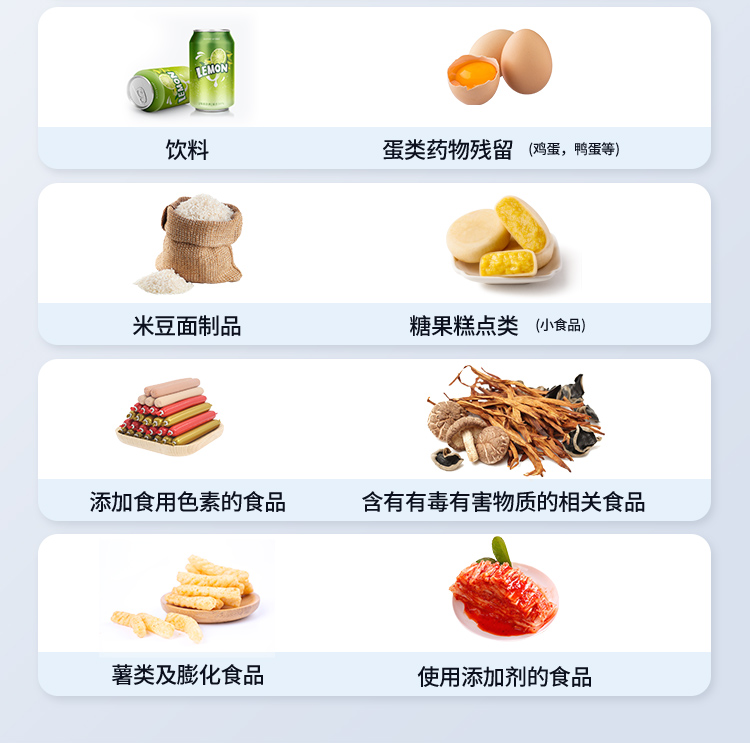 2. 檢測(cè)樣品種類:餐具及廚房用品、瓜果蔬菜及其制品、水產(chǎn)品及其制品、畜禽產(chǎn)品及其制品、嬰幼兒乳品及奶粉制品、蜂蜜、糧油及其制品、調(diào)味品(食醋、醬油、味精、鹽等)、酒類茶葉及其制品、食用菌、飲料、蛋類藥物殘留(雞蛋,鴨蛋等)、米豆面制品、糖果糕點(diǎn)類(小食品)、薯類及膨化食品、瓶(桶)裝飲用水、添加食用色素的食品、使用添加劑的食品、含有有毒有害物質(zhì)的相關(guān)食品。