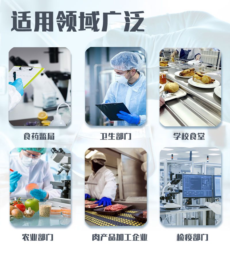 該多功能食品安全檢測(cè)儀為集成一體化食品安全快速檢測(cè)分析設(shè)備,廣泛應(yīng)用于食藥監(jiān)局、衛(wèi)生部門、高教院校、科研院所、農(nóng)業(yè)部門、養(yǎng)殖場(chǎng)、屠宰場(chǎng)、食品肉產(chǎn)品深加工企業(yè)、檢驗(yàn)檢疫部門等單位使用。