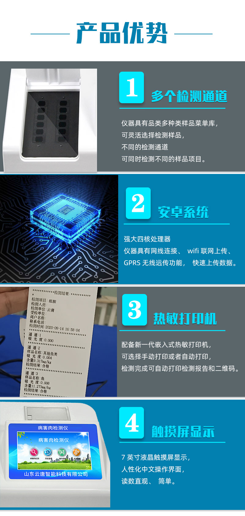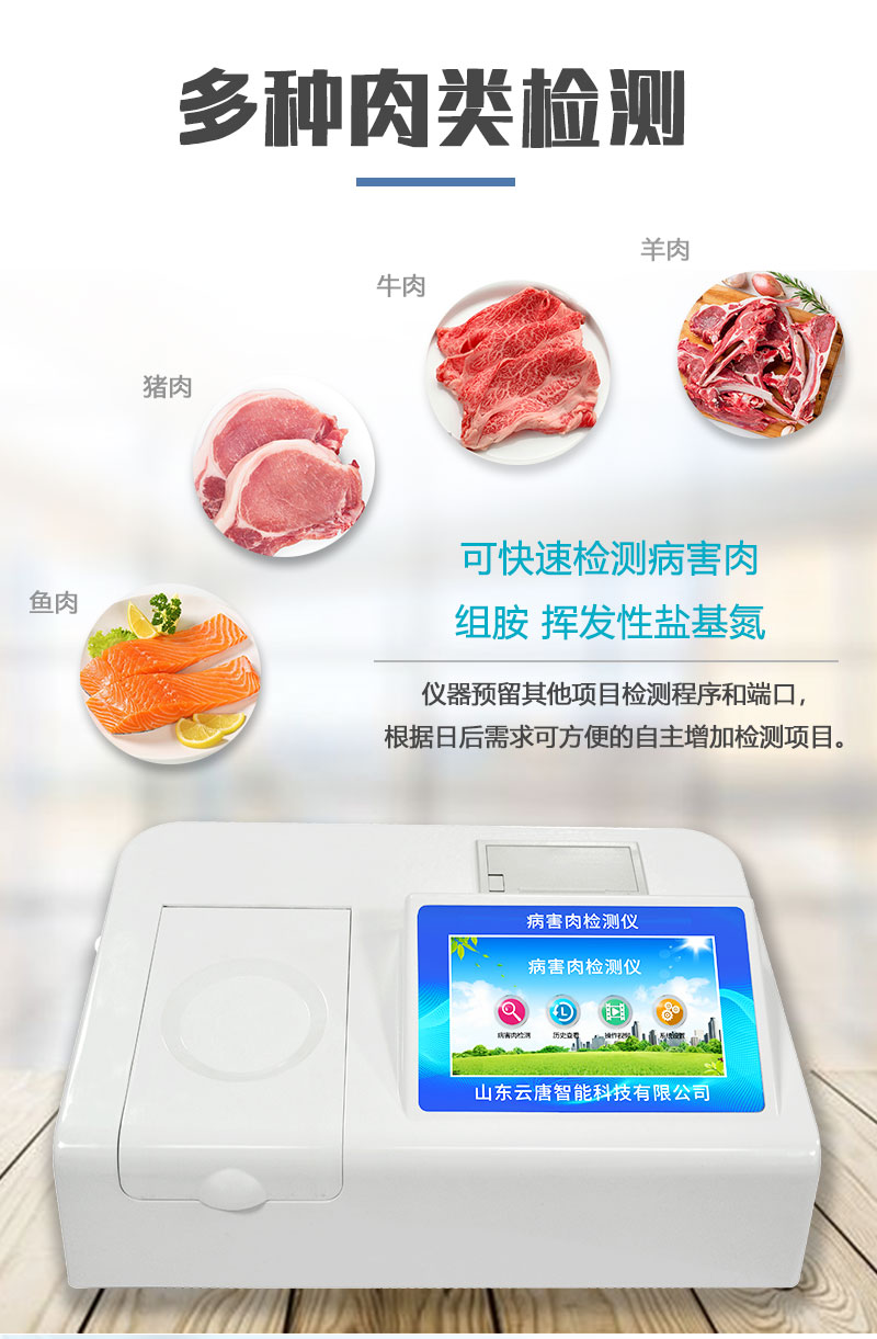可快速檢測(cè)病害肉、組胺、揮發(fā)性鹽基氮,儀器預(yù)留其他項(xiàng)目檢測(cè)程序和端口,根據(jù)日后需求可方便的自主增加檢測(cè)項(xiàng)目。