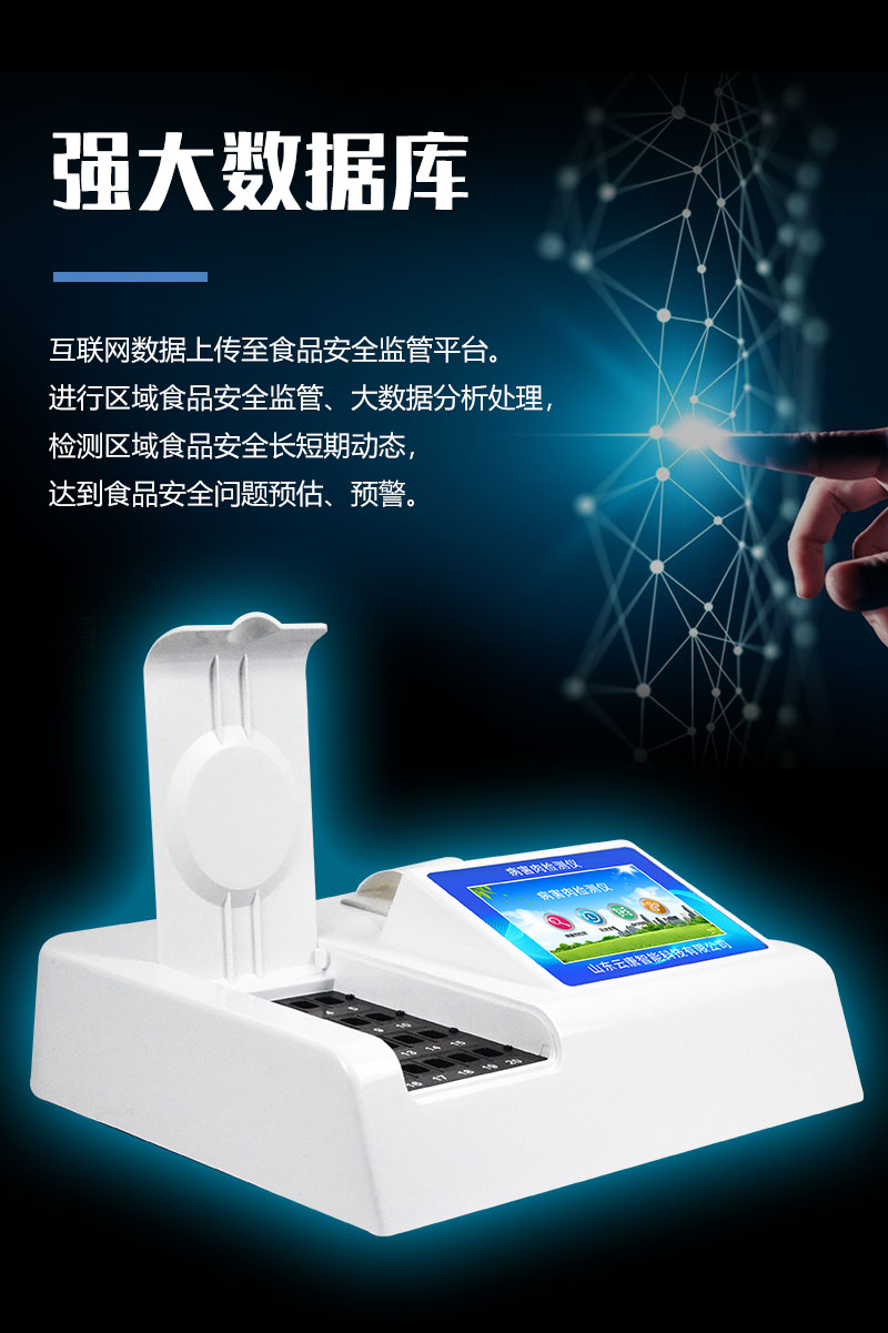 8、儀器帶有監(jiān)管平臺(tái)。數(shù)據(jù)可局域網(wǎng)和互聯(lián)網(wǎng)數(shù)據(jù)上傳,檢測(cè)結(jié)果直接傳至食品安全監(jiān)管平臺(tái)。進(jìn)行區(qū)域食品安全監(jiān)管及大數(shù)據(jù)分析處理,檢測(cè)區(qū)域食品安全長(zhǎng)短期動(dòng)態(tài),達(dá)到食品安全問(wèn)題預(yù)估、預(yù)警